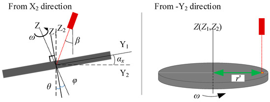 Table 2 lists the corresponding and β of seven kinds of angular velocity ω. The mean value of β is 1.8714°, the standard deviation is 0.0014°, and the coefficient of variation is 0.074%. Like the static measuring method, the measurement results of the new method also have high stability. However, the measurement results of the two methods are not the same. In particular, the result of the dynamic measurement method is 0.0406° smaller than that of the static measurement. In the next section, the main reasons for errors in the dynamic measuring device will be analyzed and discussed below.