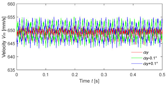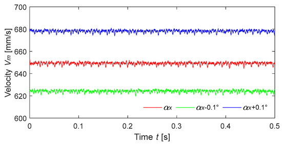 During this test, the desired radius r at the laser spot P was equal to 47.5 mm. Under the control of the DC motor, the rotating disk can achieve a smooth rotation of 1000~5000 rpm, and the rotation error accuracy is less than 2 rpm. Figure 8 shows the curves of the measured value Vm and its mean value of LDV at different angular velocities ω. It can be seen from these curves that Vm is not constant. This result has many reasons, which will be explained later in Section 5. In addition, from the perspective of amplitude, Vm fluctuates randomly around its mean value, indicating that the measured value has a strong signal-to-noise ratio. Therefore, Vm in Equation (7) can be replaced by to calculate the incident angle β of the laser beam.