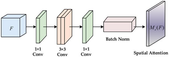 First, the input feature map underwent a convolution operation to reduce its dimensionality to , where . Then, two convolutions were applied to extract useful information from the context, followed by a convolution to adjust the dimensionality of the spatial attention map to . Finally, the spatial attention map Ms(F) was obtained after Batch Normalization (BN), as shown in Equation (1).