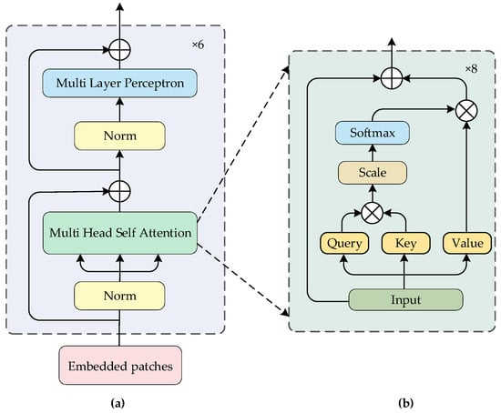 The Vision Transformer encoder consisted of L (in this study, L was set to 6) stacked encoding modules, each composed of multi-head self-attention (MSA) and a multi-layer perceptron (MLP). The structure of the encoding module is illustrated in Figure 4a. The MSA module consisted of Nh (in this paper, Nh was set to 8) individual self-attention heads. The self-attention mechanism was a fundamental component of the Vision Transformer architecture, playing a critical role in establishing pixel-level relationships and capturing global image information. Its architecture is illustrated in Figure 4b.
