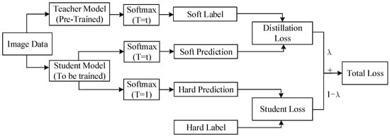 The knowledge distillation strategy resulted in a total loss consisting of the cross-entropy functions of the Teacher and Student models, as well as the cross-entropy loss between the predicted probability of the Student model and the true classification, as shown in Figure 6.