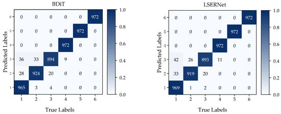 In the confusion matrix shown in Figure 9, the numbers 1 to 6 represent the classes normal, falling chunks, material block, coal break, hanging slag, and blowing down, respectively. The results indicate that coal break, hanging slag, and blowing down are relatively easy to detect among the five abnormal states of the tuyere. However, the detection efficiency for normal, falling chunks, and material block is comparatively lower. The LSERNet model achieves the best performance in detecting the normal class, but it is outperformed by the BDiT model in detecting falling chunks and material block. The BDiT model achieves the highest accuracy among the five abnormal states of the tuyere.