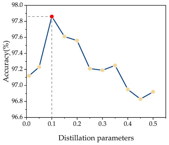 It can be seen from the broken line trend in the figure that before the distillation parameter is set to 0.1, the accuracy of the model gradually increases with the increase of the distillation parameter, reaching the highest value of 97.86% at 0.1, and then, the accuracy decreases with the increase of the distillation parameter. It further proves that the experimental distillation parameter of 0.1 is the best choice in this paper.