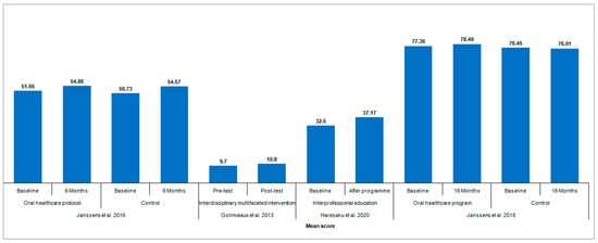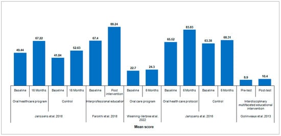 - Janssens, B.; Vanobbergen, J.; Lambert, M.; Schols, J.M.; De Visschere, L. Effect of an oral healthcare programme on care staff knowledge and attitude regarding oral health: A non-randomised intervention trial. Clin. Oral Investig. 2018, 22, 281–292. [Google Scholar] [CrossRef]