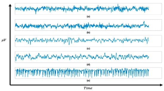 Figure 1 (a) non-epileptic recording with open eyes, (b) non-epileptic recording with closed eyes, (c) recordings of EEG from the hippocampal formation in the hemisphere opposite the epileptogenic zone, (d) EEG recordings of the epileptogenic zone, and finally (e) a collection of epileptic seizure activity recorded from the hippocampal focus [