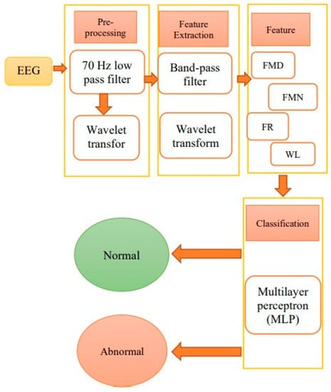 37]. Finally, a multilayer perceptron neural network (MLP) classifier was designed and applied to the data. After obtaining satisfactory results with this classifier, the wavelet transform method was applied separately. The diagram of the proposed method is shown in