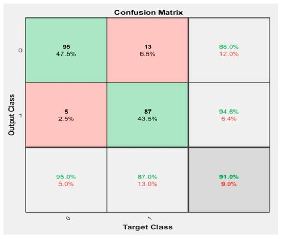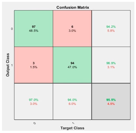 Figure 3, the clutter matrix summarizes the obtained results. This matrix is used to explain the accuracy of the classification and each house expresses a specific value of perceptron multilayer neural network. In order from the right, each house represents sensitivity, specificity, and accuracy. The results of the validation of the 10-layer neural network used to classify the signal with 95.5% accuracy are shown in
