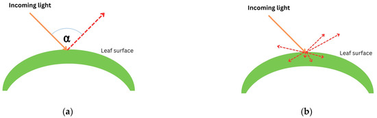 When light passes through a leaf, there will be some interactions between the plant and light. The interactions include (i) reflection, (ii) scattering, (iii) absorption, and (iv) transmission [50,52]. Reflection occurs when light is bounced back after entering the leaf’s surface. When light is reflected by a different angle caused by a different shape of the leaf structure, it is called scattering. In terms of absorption (mathematically described as ), electrons accept photons’ whole energy and are displaced to a higher configuration in the form of thermal energy. Otherwise, transmission occurs when atoms pick up the wave, vibrate briefly, transmit the vibration through the body of the leaf, and emit the wave as light at the other end. Figure 2 illustrates how light interacts with a leaf surface.