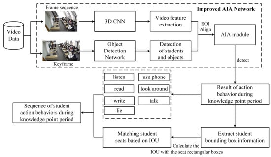 The overall system structure diagram of the student action behavior recognition model proposed in this paper is shown in Figure 1. Firstly, the spatiotemporal features of classroom video are extracted based on the backbone network in the improved AIA network. Secondly, students and objects such as books and mobile phones are detected by using the object detection model applicable to the classroom scenario; then, the spatiotemporal features of the video and the spatial coordinate information of the students are fused to detect the student’s action behaviors. Finally, based on the action behavior recognition results during the teaching time of the knowledge points, the student’s seat number is used as the index to correlate the student’s action behavior sequence during the period.