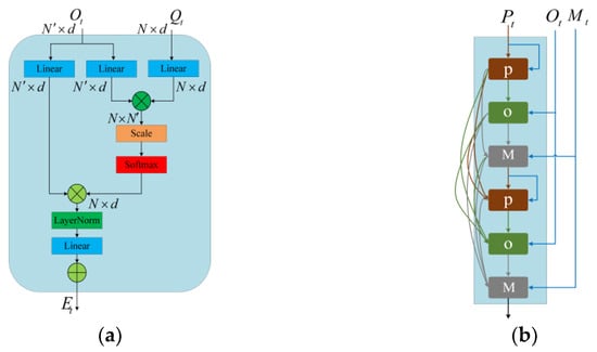The IA structure consists of multiple interaction blocks improved based on transformer blocks [33], each modeling a single type of interaction through an attention mechanism. Interaction blocks are divided into three types in total: P-Block, O-Block, and M-Block. P-Block is used to model human–human interaction (including self-interaction) in the same clip, and its query and key/value are both student features or enhanced student features; O-Block is used to model human–object interaction, and its key/value input is the object features . Figure 3a shows an illustration of an O-Block; M-Block is used to model the same human at different frames of time interaction, and its key/value input is the memory features .