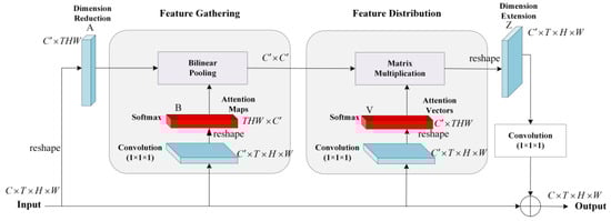 (2) Feature Distribution. After the global features are collected from the frame sequence, the input is first transformed by a convolutional layer to obtain the feature map . The elements within are normalized using the softmax function, i.e., , and are parameters of the convolutional layer; then, the attention vectors at each position of the feature map are multiplied by the global features and a subset of the global feature vectors can be adaptively assigned according to the weight magnitude of each vector , as shown in Equation (8):