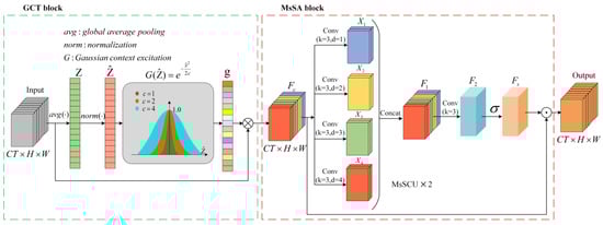 The video data captured in this study have a large resolution; a large difference in pixel size occupied by front and back row students in space; and the need to extract small object features , such as books and mobile phones around the students, along with other types of features, to model the interaction. Literature [35] shows that multi-scale receptive field is helpful for the network to notice the spatial position of different size objects. Therefore, a Multi-scale Spatial Attention (MsSA) block is added to the slow pathway of the video backbone network to obtain contextual information of a larger receptive field; at the same time, to allow the network to learn the weight response of the feature maps of different channels in the process, the MsSA block is cascaded with Gaussian Context Transformer (GCT) [36] to form an MsCSA module. The MsCSA module is shown in Figure 7.