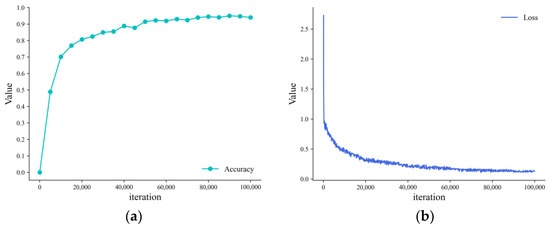 Accuracy and loss curves of the improved AIA network: (a) accuracy curve; (b) loss value curve.