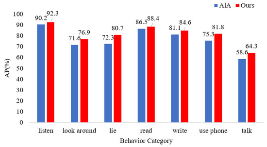 As can be seen from Table 3, after integrating the MsTA module and the MsCSA module into the AIA network, the mAP values of student action detection improved. Students’ different action behaviors during class have different durations and visual speeds, and the MsTA module can extract action behavior features with different time scales. For example, when students are listening carefully, they usually look up and face the teacher, and there is not much posture change between the current frame and the history frame; however, when students are looking around, the module needs to combine the temporal features of multi-frames to recognize the student’s “looking around” behavior. When students are reading, writing, or using mobile phones, they will turn the book, take a pen, or touch the book or mobile phone and the MsCSA module expands the receptive field in the space and enhances the response of the mobile phone, book, and other objects in the feature map, thus enhancing the interaction features of the student and the object so that the network better recognizes the interaction behaviors such as reading, writing, or using mobile phones.