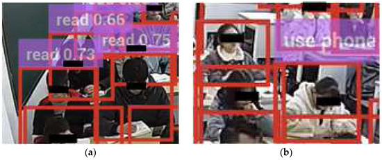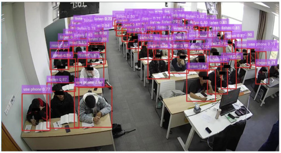 In Figure 11, the improved AIA network model can detect students’ action behaviors such as listening, reading, and using mobile phones during class. Since the number of students in the classroom is large and the boxes are dense, Figure 12 shows an example of the detection of action behaviors in a local area.