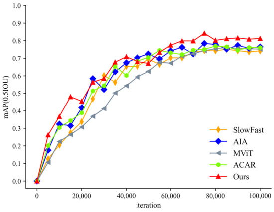 As can be seen from Table 4, the mAP values of the network proposed in this paper are higher than those of other networks, which are 7.1%, 6.1%, 5.2%, and 4.8% higher than those of SlowFast, MviT, ACAR, and AIA networks, respectively, indicating that the improved model has better accuracy in the detection of spatiotemporal-oriented students’ action behaviors. The mAP curves during the experiments of different models are shown in Figure 13.