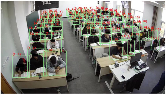 The action behavior of the students in the classroom is detected by the action behavior recognition method described in Section 3.1. Then, each student’s seat is matched using the method described in Section 3.2. The seat matching result at a certain point in time is shown in Figure 14. The seat is denoted as , where stands for rows of seats and stands for columns of seats.