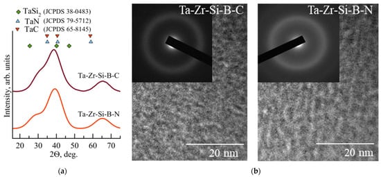 XRD patterns (a), SAED patterns and BF TEM images of the structure (b) of Ta-Zr-Si-B-N and Ta-Zr-Si-B-C as-deposited coatings.