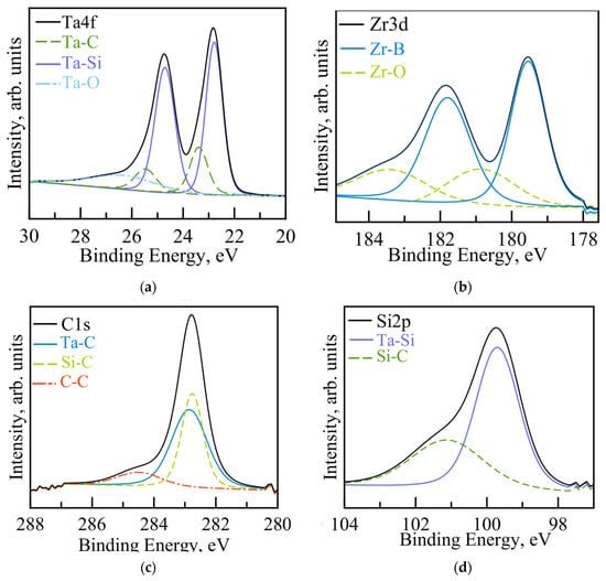 In the Ta4f spectra, two doublets are observed at positions 22.7 and 24.7 eV and 23.4 and 25.5 eV, related to the Ta-Si and Ta-C bonds, respectively [34]. The low intensity peak at position 26.5 eV can be attributed to Ta-O bonds [34]. The high intensity of the Ta-Si peaks indicates the predominance of this bond in the coating. According to the Zr3d spectra, the doublet at binding energies of 179.5 and 181.9 eV indicates a Zr-B bond [35]. Peaks at 181.0 and 183.3 eV correspond to the bond of zirconium with oxygen [35]. Peaks in the C1s spectrum in the range of 282–284 eV indicate the presence of Ta–C and Si–C bonds; there is also a low-intensity C-C peak [34]. The Si2p spectrum confirms the presence of Si-C and Ta-Si bonds [36].