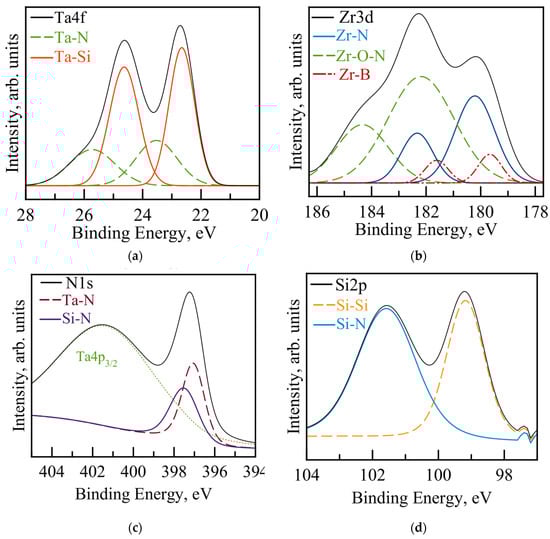 A doublet was found in the Ta4f spectrum at positions 22.7 and 24.7 eV, corresponding to the Ta-Si bond [34]. Low-intensity peaks at positions 23.7 and 25.7 eV correspond to the chemical state of Ta in the cubic or hexagonal Ta-N phase [37]. Also, the presence of Ta-Si-N bonds cannot be excluded. Three doublets were revealed in the spectrum of Zr3d, which can be attributed to the Zr-B, Zr-N and Zr-O-N bonds, respectively [38]. The spectra of N1s show an intense peak at 397.3 eV, which appeared as a result of the overlap of the Ta-N [39] and Si-N [40] peaks. It is also impossible to exclude the presence of B-N bonds at 396.7–397.5 eV [41]. Peaks at 99.3 and 101.6 eV in the Si2p spectrum correspond to Si-Si and Si-N bonds [40].