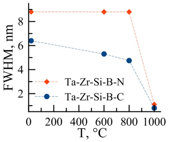 For a more detailed study of the change in the structure of the Ta-Zr-Si-B-C coating during heating, the FWHM parameter was determined (Figure 5).