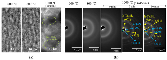 BF TEM images (a) and SAED patterns (b) at temperatures of 600, 800 and 1000 °C, recorded during exposure (b), for the Ta-Zr-Si-B-N coating.