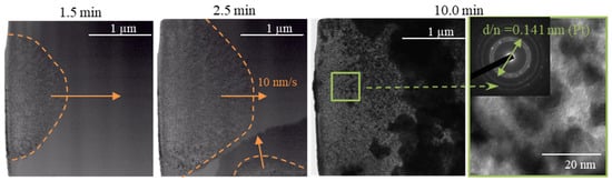 The results showed that heating in this temperature range did not lead to a change in the structural-phase state of the Ta-Zr-Si-B-N coating (Figure 6a). In all cases, the SAED patterns exhibited broad reflections (Figure 6b) typical of amorphous materials [45]. Crystallization of the coating was observed only during exposure at a temperature of 1000 °C. Shooting BF TEM images at low magnification made it possible to register the movement of the crystallization front at a speed of 10 nm/s (Figure 7). A video of the crystallization process is given in the Supplementary Material (Video S1).