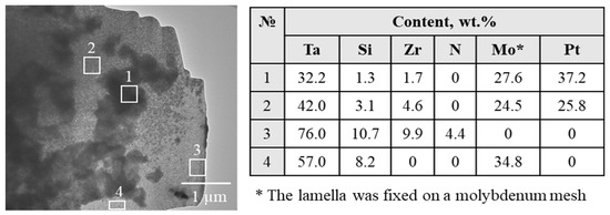 At a maximum exposure of 10 min, the formation of local areas of grain accumulation (dark areas in TEM images) rich in platinum was observed (Figure 8, points 1, 2). According to EDS analysis, the studied zone at the lamella boundary (point 3) corresponded to the coating material and had the following composition: 76 wt.% Ta, 10.7 wt.% Si, 9.9 wt.% Zr and 4.4 wt.% N. Note that the determination of the boron concentration using the EDS method is difficult.