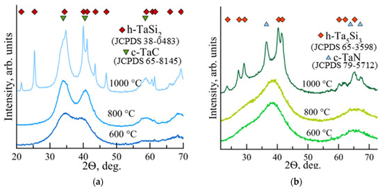 For the Ta-Zr-Si-B-C coating (Figure 9b), an increase in temperature from 20 to 600 and 800 °C led to the separation of peaks in the 2Ꝋ = 20–50 and 55–75° and an increase in their intensity, which indicates phase segregation. At a temperature of 1000 °C, crisp peaks corresponding to reflections from the (100), (101), (102), (111), (112) and (114) planes of the h-TaSi2 phase and the (111), (200) and (220) planes of the c-TaC phase were detected on the XRD patterns. The size of the h-TaSi2 and c-TaC crystallites, determined by the most intense lines (111) using the Scherrer formula, was ~20 and ~10 nm, respectively.