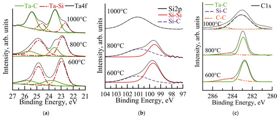 The XPS spectra of Ta4f, Si2p and C1s for the Ta-Zr-Si-B-C coating after vacuum annealing at temperatures of 600, 800 and 1000 °C are shown in Figure 9. The positions of the Ta-Si and Ta-C lines in the Ta4f spectra (Figure 10a) remained almost unchanged from a temperature rise from 20 to 1000 °C.