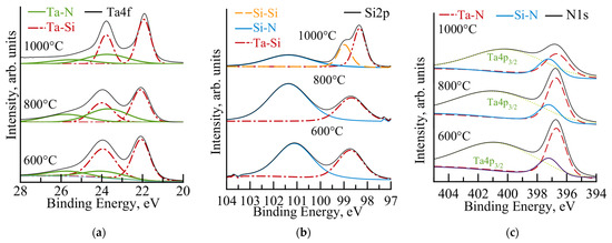 According to the Ta4f spectra (Figure 11a), the Ta-Zr-Si-B-N coating is heated from 20 to Si towards a lower binding energy, which is associated with an increase in the fraction of tantalum in Ta-Si bonds [49] and indicates the formation of the Ta5Si3 phase. The Si2p spectra (Figure 11b) show that an increase from 20 to 800 °C is accompanied by a decrease in the intensity of the Ta-Si peak. At 1000 °C, the division of the peak (97–100 eV) into two peaks at the positions 98.4 eV and 99.0 may be due to an increase in the fraction of tantalum in Ta-Si and the release of free silicon (Si-Si bond) due to the h-TaSi2 phase transition to h-Ta5Si3. At the same time, the intensity of the Si-N peak decreased. This effect is associated with the redistribution of silicon atoms between Si-N and Ta-Si with increasing temperature. The appearance of the N1s (Figure 11c) spectra practically did not change with increasing temperature.