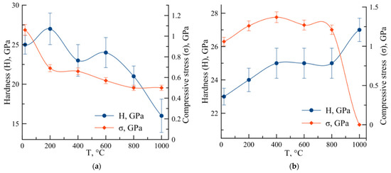 For the Ta-Zr-Si-B-C coating, an increase in temperature from 20 to 1000 °C was accompanied by a gradual decrease in hardness from 25 to 16 GPa and in the level of internal stresses from −1.1 to 0 GPa (Figure 12a). A decrease in internal stresses during thermal exposure may be associated with the ordering of the coating structure and the crystallization process [50,51]. A decrease in the hardness of the Ta-Zr-Si-B-C coating by 36% may be associated with stress relaxation during thermal exposure, by analogy with [52].