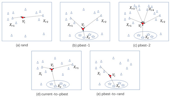 Figure 2 roughly depicts the behavior of each strategy, the individuals in ellipse are the elite individuals, and the remaining triangle icons represent other common individuals. The red circle in Figure 2 represents the new individual generated by the corresponding strategy. With the “rand” strategy, the position of the new individual in Figure 2a is between two different individuals, and it is close to the first random individual. Actually, its position falls within a circle with as the center and as the radius. The behavior of the “rand” strategy makes the algorithm focus more attention on a global search. Similarly, the position of the new individual in Figure 2b is between an elite individual and two different common individuals with the “pbest-1” strategy. This strategy leads the algorithm to learn the elite’s information, while focusing on a global search. With the “pbest-2” strategy, the position of the new individual in Figure 2c is also in the center of the selected individuals, this makes our algorithm utilize more individual sampling information. As shown in Figure 2d, the position of the new individual is affected by the current individual, an elite individual, and a randomly selected individual in the “current-to-pbest" strategy. The position of the new individual in Figure 2e is based on the elite individual and current individual, which comprehensively takes the current individual and elite individual into consideration.