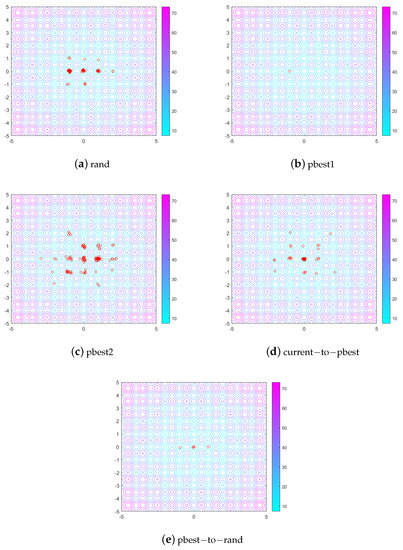 In this experiment, we obtained the two-dimensional individual distribution for the five strategies after 20 generations, and present the results in Figure 3. The initial population size of each strategy was 100. From Figure 3a, these individuals may be seen to disperse around local maxima, although the local maxima are still distant from the global maxima. Thus, it is obvious that the “ABC/rand” strategy has a strong exploration ability but weak exploitation ability. We can see clearly that all individuals converge around one local optimum in Figure 3b, but the local optimum is not the global optimum. Thus, it has a strong exploitation ability but weak exploration ability. The “ABC/pbest-2” strategy originates from “ABC/pbest-1”, but with increased exploration ability. This modification causes most individuals to distribute around global optimum, with some individuals located around other local optima. The results in Figure 3c further demonstrate that the “ABC/pbest-2” strategy increased its exploration ability while keeping its exploitation ability. As for the results in Figure 3d, the “ABC/current-to-pbest” strategy uses the information of the current individual, a random different individual, and a random elite individual. Thus, it has a strong exploration ability during early generation and a strong exploitation ability during late generation. As we can see from Figure 3e, under the influence of “ABC/pbest-to-rand”, the individuals mainly converged around the global optimum, with others also located near local optima. This was dominated by but also uses the current individual information. Thus, it maintains a significant capacity for exploitation, while also having the opportunity to leave the local optima and go to a global or nearby one.