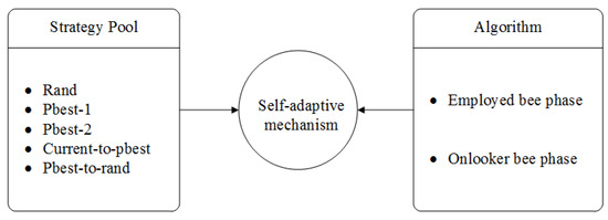 To maximize the algorithm’s efficiency, we must choose a more appropriate approach in different phases of the algorithm, due to the distinctive characteristics of the aforementioned five alternative search strategies. As a result, we include an adaptive mechanism in our suggested algorithm, to choose the best strategy. The fundamental principle of self-adaptation is to dynamically modify the potential for choosing an appropriate approach, in accordance with the success information about producing superior solutions. The selection likelihood of one strategy increases when an exceptional solution is produced by this strategy. Additionally, any tactic has the chance to be picked out during the evolution, owing to the roulette selection system. Such a self-adaptive system can help the population move beyond the local ideal, as well as toward the optimal. The combination of this self-adaptive mechanism with the aforementioned five techniques is depicted in the flowchart in Figure 4.