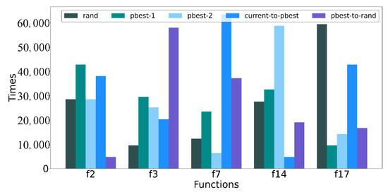 To determine the contribution of each strategy, we counted the use times of each strategy during the whole processes for two multimodal functions (, ) and three unimodal functions (, , ). The outcomes are displayed in Figure 6. As shown in the figure, the strategies with the highest frequency for f2, f3, f7, f14, and f17 were “pbest-1”, “pbest-to-rand”, “current-to-pbest”, “pbest-2”, and “rand”, respectively. Among the five single strategies in Table 1, “pbest-1”, “pbest-to-rand”, “current-to-pbest”, “pbest-2”, and “rand” produced the best results for the f2, f3, f7, f14, and f17 functions, respectively. Taking function f7 as an example, “current-to-pbest” had the best performance and “pbest-to-rand” came second among the results of the five single techniques shown in Table 1. According to Figure 6, the suggested self-adaptive mechanism chose the strategy “current-to-pbest” most, followed by “pbest-to-rand”. This phenomenon explains why the adaptive selection approach worked so well. The self-adaptive mechanism had the capability to adaptively choose the best approach in accordance with the requirements of the problem, so that the quality of the solutions was improved.