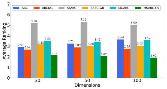 To be more intuitive, we used the Friedman test [34] to rank all algorithms across all test problems, with the results shown in Table 5 and Figure 7. It is worth noting that the Friedman test uses the post hoc technique [35,36,37,38], and the lower the ranking, the better the overall performance of the algorithm. From the data, we can see the average rank of SAABC-CS was always the first for 30, 50, and 100 dimensions. Therefore, SAABC-CS’s effectiveness was always superior to the others on all dimensions.