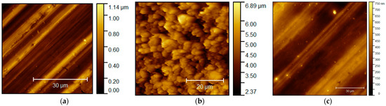 The surface morphologies of the uncoated and coated aluminum alloys are depicted in Figure 1 by AFM (Atomic force microscope, Nanosurf easyScan2, Liestal, Switzerland). The surface of the uncoated Al alloy, as shown in Figure 1a, exhibits the ridge-valley line type roughness resulting from the fabrication process and has a shiny appearance due to the metal reflectivity of the Al. In contrast, the coated hydrophilic surface, as shown in Figure 1b, shows a more uniformly distributed protrusive type roughness (roughness of about 0.7 µm) and has a dull light blue appearance. Moreover, the observable color difference between the uncoated and hydrophilic coated fin surfaces prevents the misuse of either one in practical applications. On the other hand, the surface hydrophobic coated surface, as shown in Figure 1c, is geometrically similar to that of the uncoated one and could be misused.