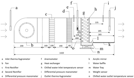 A schematic diagram of the airflow channel of the present study is depicted in Figure 4, including mainly a centrifugal fan, two-stage flow straighteners, and a heat exchanger section with a mirror water tray for collecting the water condensate. The flow channel was an open-type facility with a rectangular cross-sectional area made of acrylic plates. The dimensions of the channel were 1420 mm (length) by 170 mm (width) by 154 mm (height). The channel was designed in such a way that different heat exchangers could be installed for various tests. A fan of 135 W (TF 150, Shenzhen, China) was used to deliver the airflow. The temperatures of the cooling air and chilled water were measured by Rotronic HC2a-s (accuracy of ±0.15 °C) and Sensor PT100a (accuracy of ±0.15 °C), respectively. Air humidity was also measured by Rotronic HC2a-s (accuracy of ±1%). The airspeed and pressures were measured by Sailsors tf100 (accuracy of ±3%) and Nagono Keiki GC52 (accuracy of ±1%), respectively. Industrial experience indicates that water splash could occur in the datacenters with the indoor temperature and humidity being 24.5 °C and 76%RH, respectively. Hence, the present test environment was kept at the condition of constant temperature and humidity of 24 °C and 80%RH, respectively, by using PID controllers to control the electric humidifier and heater while maintaining the chilled water inlet temperature at 7 °C.