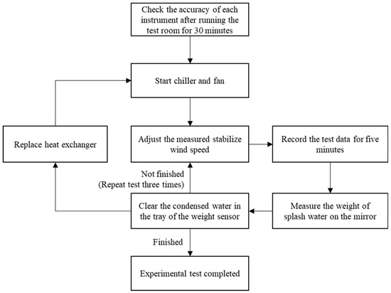 The experimental procedure is illustrated in Figure 5. In the beginning, the test chamber was warmed up for at least 30 min to reach the steady state environmental conditions of 24 ± 0.1 °C/80 ± 2%RH and the steady state inlet chilled water temperature of 7 °C. Then, both the chilled water and the centrifugal fan system were turned on. Afterwards, the airspeed in front of the heat exchanger in the test channel was adjusted to the targeted steady testing speed of 2.5, 3, 3.5, 4, 4.5, and 5 m/s, respectively, by controlling the rotational speeds of the fan. At these air speeds, the maximum turbulence intensity of the flow determined by a hot wire (with an over-heat ratio of 0.7) was about 1.2%. Under these steady conditions, the weight of the condensate splashed and accumulated for five minutes into the water tray was measured. In the process, all the pressures, airspeeds, and temperatures were measured for further analysis. The experiment for each condition was repeated three times to obtain the average results. The experiments were conducted until all of the heat exchangers were tested.