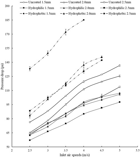 The effect of airflow speeds on the pressure drops of heat exchangers is depicted in Figure 6. Three trends can be observed. Firstly, the pressure drop increases almost linearly as the airspeed increases, irrespective of surface coating conditions. This is expected due to larger flow frictional resistances at higher speeds. Secondly, a larger fin pitch results in a smaller pressure drop, also irrespective of surface coating conditions; also expected because of smaller geometric constraints on the airflow at larger fin pitches. Lastly, by compared to the uncoated cases, hydrophobic surface coating leads to larger pressure drops; whereas, hydrophilic surface coating leads to smaller pressure drops. Specifically, compared to the uncoated cases, the pressure drops of hydrophilic coated cases can be reduced by about 20–24%, 36–43%, and 43–50% for the fin pitches of 1.5 mm, 2 mm, and 2.5 mm, respectively. This kind of trend was also observed by Ma et al. [3,4]. The pressure drop of the hydrophilic coated surface of pitch 1.5 mm (having the largest fin density of all the cases investigated as listed in Table 1) is still smaller than all of the uncoated cases, indicating the effectiveness of hydrophilic surface coating in reducing the pressure drop of fin-and-tube exchangers by modifying the surface morphology as illustrated in Figure 1. In practical applications, reducing the pressure drop is essential to save fan energy. Even though a lower pressure drop can be obtained by a larger fin pitch, enlarging the fin pitch is not desirable because it will reduce heat transfer due to a smaller FPI. Namely, it would be more practical to lower the pressure drop by surface coating than by enlarging the fin pitch. It should also be cautioned that the hydrophobic surface coating of 1.5 mm in fin pitch results in a considerably larger pressure drop by about 55% to 75% and should be avoided if environmental contamination could lead to hydrophobic surface modifications from the originally uncoated surfaces.