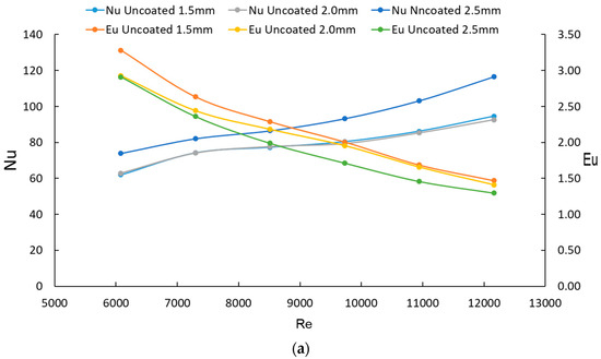 To further examine the behavior of heat exchanger performance, the pressure drops and heat transfer rates described above are non-dimensionalized in terms of Euler number (Eu) [22], Reynolds number (Re), and Nusselt number (Nu) through Equations (2)–(4):