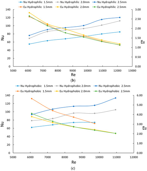 Distributions of Nu and Eu versus Re. (a) Uncoated heat exchanger; (b) Hydrophilic coated heat exchanger. (c) Hydrophobic heat exchanger.