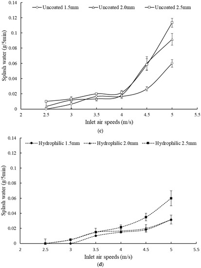 The results of splashed water measured are shown in Figure 9, Figure 9a for the overall view whereas Figure 9b–d are locally expanded scales to show the results of uncoated and hydrophilic coating in more detail. Three trends can be observed. Firstly, water splash will occur if the air speed is large enough, irrespective of surface coating conditions. Specifically, the threshold air speeds for water splashing are smaller than 2.5 m/s, about 2.5 m/s, and about 3.0 m/s for the hydrophobic coated, uncoated, and hydrophilic coated fin surfaces. Secondly, water splash of the hydrophobic coated surfaces is the largest, uncoated second, and hydrophilic coated the smallest, for all the fin cases, irrespective of fin pitches and coating conditions. That is, the hydrophilic surface fin coating reduces the amount of splashed water significantly by about one to two orders and about two times with respect to the hydrophobic coated and uncoated surfaces, respectively; thus, it is an effective method of mitigating the water splash situation. Thirdly, critical air speeds for which the amount of water splash increases dramatically exist for both hydrophobic coated and uncoated surfaces, the former being about 3.5 m/s and the latter about 4 m/s. In contrast, for the hydrophilic coated surfaces, no such speed is noticed as the increase is gradual. Hence, by hydrophilic surface coating, the splash amount can be greatly reduced and even completely prevented for smaller air speeds; the result is consistent with those in the literature [8,10,18].