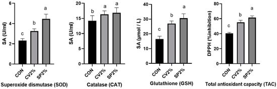 Effect of chlorella (CV2%) and spirulina powder (SP2%) supplementation on the enzymatic specific activity (SA) of superoxide dismutase (SOD), catalase (CAT), glutathione (GSH), and total antioxidant capacity (TAC), expressed as U /l or % inhibition of sanguine serum; (n = 6). abc Mean values within a column having different letters are significantly different at p ≤ 0.05.
