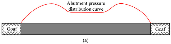 Before the coal mining on both sides, the working face is subjected to the static load transmitted by the overlying strata, and the abutment pressure is evenly distributed. After mining on both sides, the strip coal pillar is formed and produces a certain range of plastic area under abutment pressure. When the strength and size of the strip coal pillar (the width of the elastic area is sufficient) can support the load transmitted by the overlying strata, the lateral abutment pressure distribution of the strip coal pillar shows a pattern of increasing from the boundary of the coal pillar to the center, then decreasing and finally stabilizing, and the overall distribution of the abutment pressure is similar to the “saddle-shape”, as shown in Figure 2a.