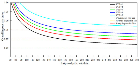 According to the mining technical conditions of the C8301 working face, L1 = 80 m, L2 = 130 m, lp = 8 m, ld = 15 m, lr = 4 m, σd = [σc] = 11.09 MPa, λ = 4, and γ = 25 kN/m3. Putting the relevant parameters into Equation (14), the relationship between the elastic energy index and the width of the strip coal pillar on the overall impact risk of the working face is shown in Figure 6.