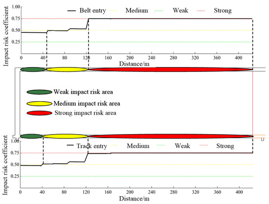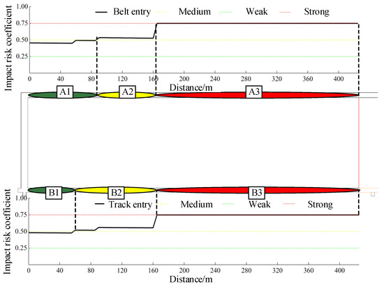 By putting Equations (19)–(21) into Equations (12) and (13), the C8301 working face’s belt entry, track entry, and working face are divided into six impact risk areas, including two weak impact risk areas, two medium impact risk areas, and two strong impact risk areas, as shown in Table 3 and Figure 7.
