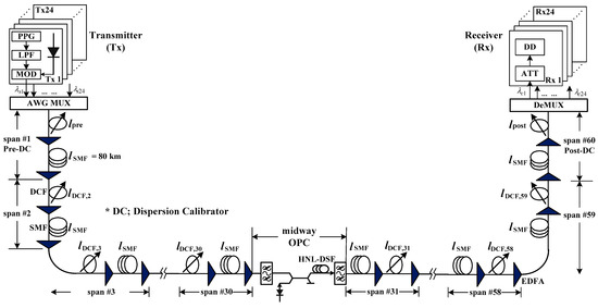 Through previous studies, the authors also confirmed that the dispersion map optimization has significant effect on signal distortion compensation in SMF-based WDM systems [12,13]. Furthermore, even in the system where the OPC is not located in the middle of the entire transmission line (i.e., non-midway OPC system), we have confirmed that the improved compensation for the entire WDM signal can be obtained by applying a properly designed dispersion map considering the WDM channel data-rate, modulation format, and OPC location [13].