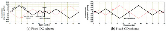 The first case is that the residual dispersion assigned to all fiber spans is assumed to be same for all FSGs. The dispersion maps shown in Figure 2a,b correspond to the first case. Analyzing the dispersion map of Figure 2a, the rate of increase/decrease in the cumulative dispersion in all FSGs is the same regardless of the number of the fiber spans each FSG has. That is, if the rate of the cumulative dispersion in an FSG consisting of two fiber spans is ±100 (ps/nm)/span, the increase/decrease rates of the cumulative dispersion in all other FSGs also have the same value. For this reason, we will call the dispersion map in Figure 2a,b the ‘fixed’ scheme.
